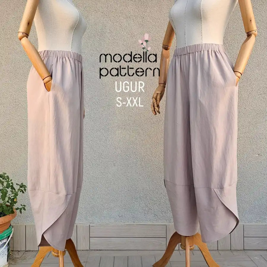 Easy summer pants pattern with elastic waistband and 2 pockets. Includes PDF pattern (A4, A0, US Letter) and sewing tutorial.The UGUR Pants – where comfort meets effortless style.